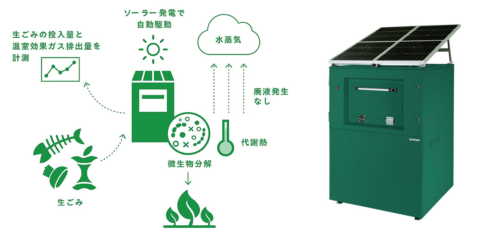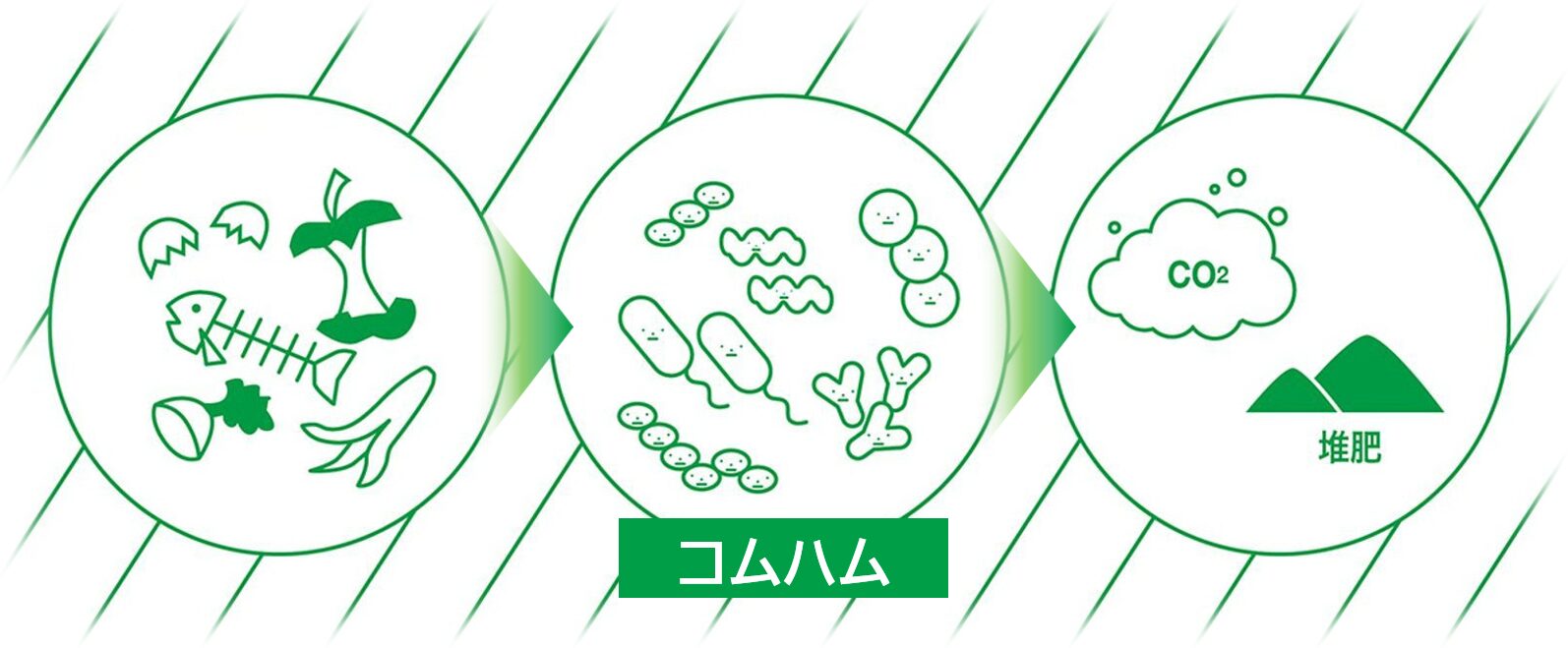 アイヌ語で”枯葉・枯草”という意味をつ微生物“コムハム”は、たった1日で投入した生ごみの98%を土に還す高速分解能力を持っています。komhamさんは、この微生物群を利用した独立型の生ごみ処理機「スマートコンポスト®」を開発し、東京都-渋谷区や明石市、つくば市などの都市部にて、普及に向けた実証実験を重ねています。また、2024年7月からは、量産品販売も行っています。