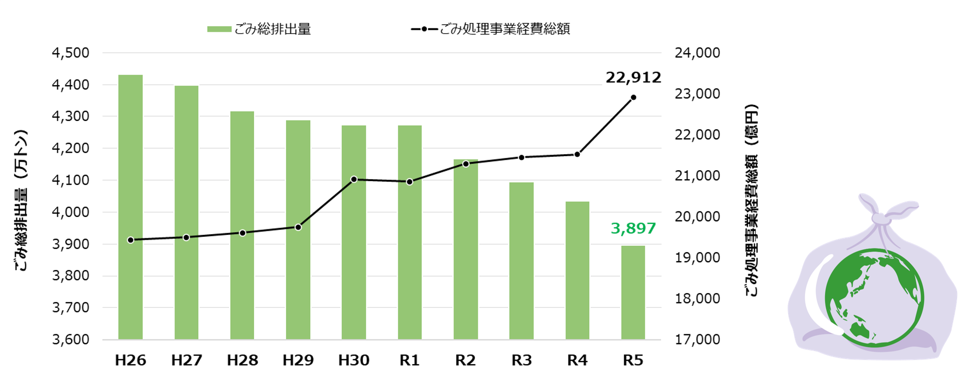 「臭い物に蓋をする」という言葉があるように、毎日の生活から出るたくさんの「ごみ」は、私たちの見えないところで処理されています。環境省の調査によると、令和5年度のごみ総排出量は約3,897万トン―数字だけを見れば、排出量は年々減っていますが、その処理方法には色々と課題があります。